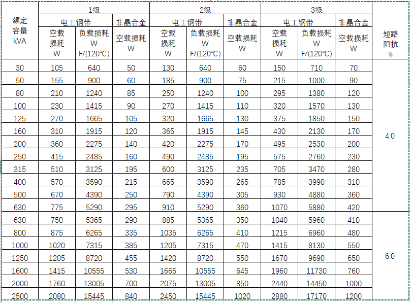 為了減少變壓器損耗,提高電能利用效率,國(guó)家市場(chǎng)監(jiān)督管理總局和國(guó)家標(biāo)準(zhǔn)化管理委員會(huì)發(fā)布了國(guó)家標(biāo)準(zhǔn)GB 20052-2020《電力變壓器能效限定值及能效等級(jí)》,將變壓器能效等級(jí)分為3個(gè)等級(jí),分別是1級(jí)、2級(jí)和3級(jí),并規(guī)定了各級(jí)能效限定值(在規(guī)定測(cè)試條件下,變壓器空載損耗和負(fù)載損耗的允許最高限值),其中1級(jí)能效最高,損耗最低。